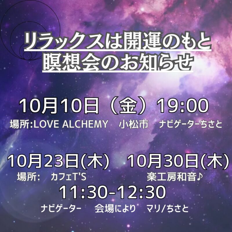 10月の瞑想会のお知らせ 2025 10/11 イベント・セミナー情報 2025年10月11日 イベント・セミナー情報 よかったらシェアしてね! URLをコピーしました! 関連記事 10月イベントのお知らせ 2025年10月11日 後手後手~な報告(;^_^A 2023年10月27日 8月26日(土)27日(日)花咲くマルシェ イベント参加 2023年7月28日 8月6日はリアル魔法学校の全国同時中継イベント&体験版も受けられるよー 2023年7月28日 7月22日23日イオン示野イベント終了しました。 2023年7月28日 あさっては、イベントだ! 2023年7月7日 7月9日(日)10:30~17:30 癒しと占いイベント開催!! 2023年6月14日 4月15日(土)16日(日)シャンバラin白山vol.2開催します 2023年3月29日